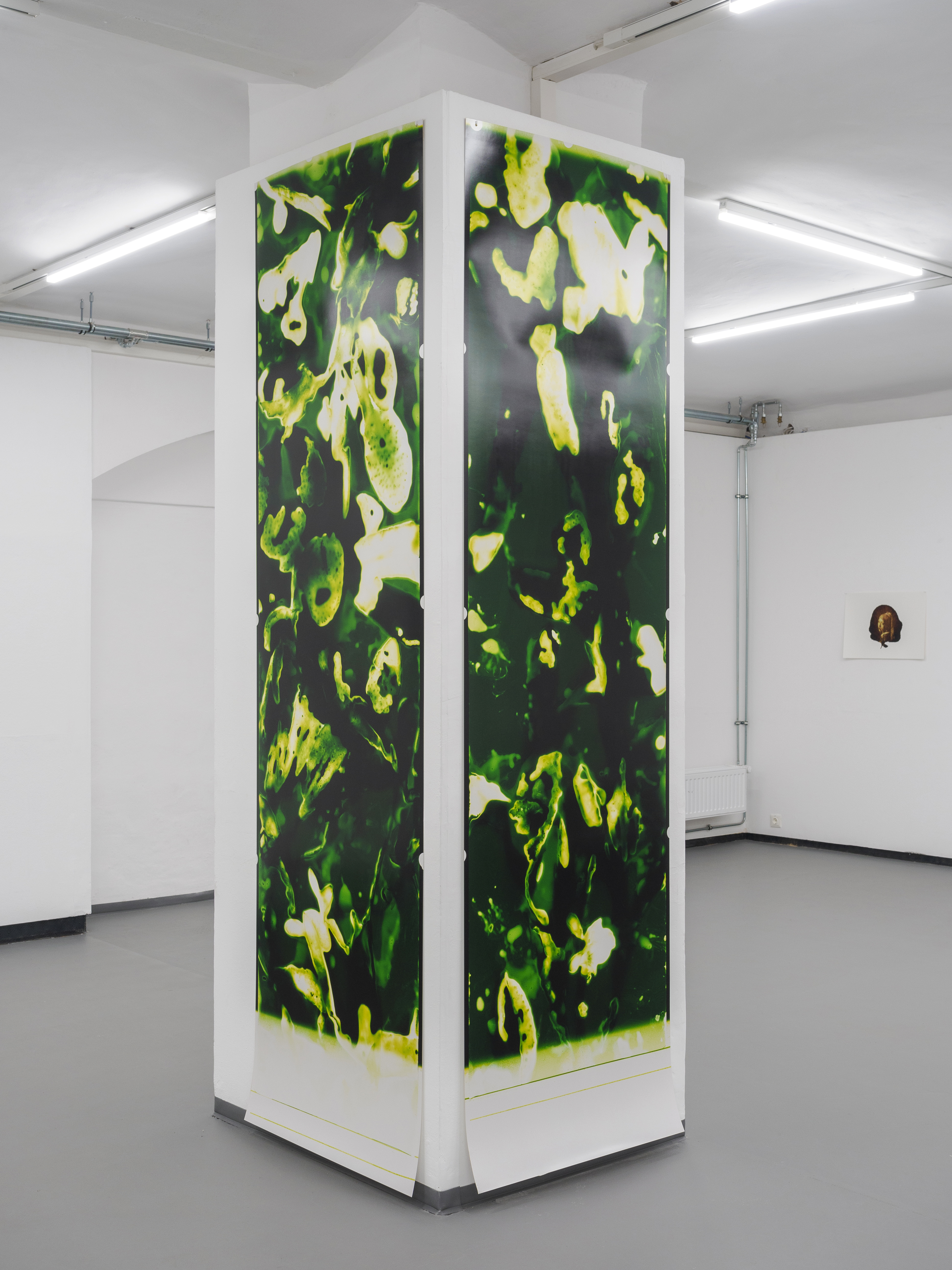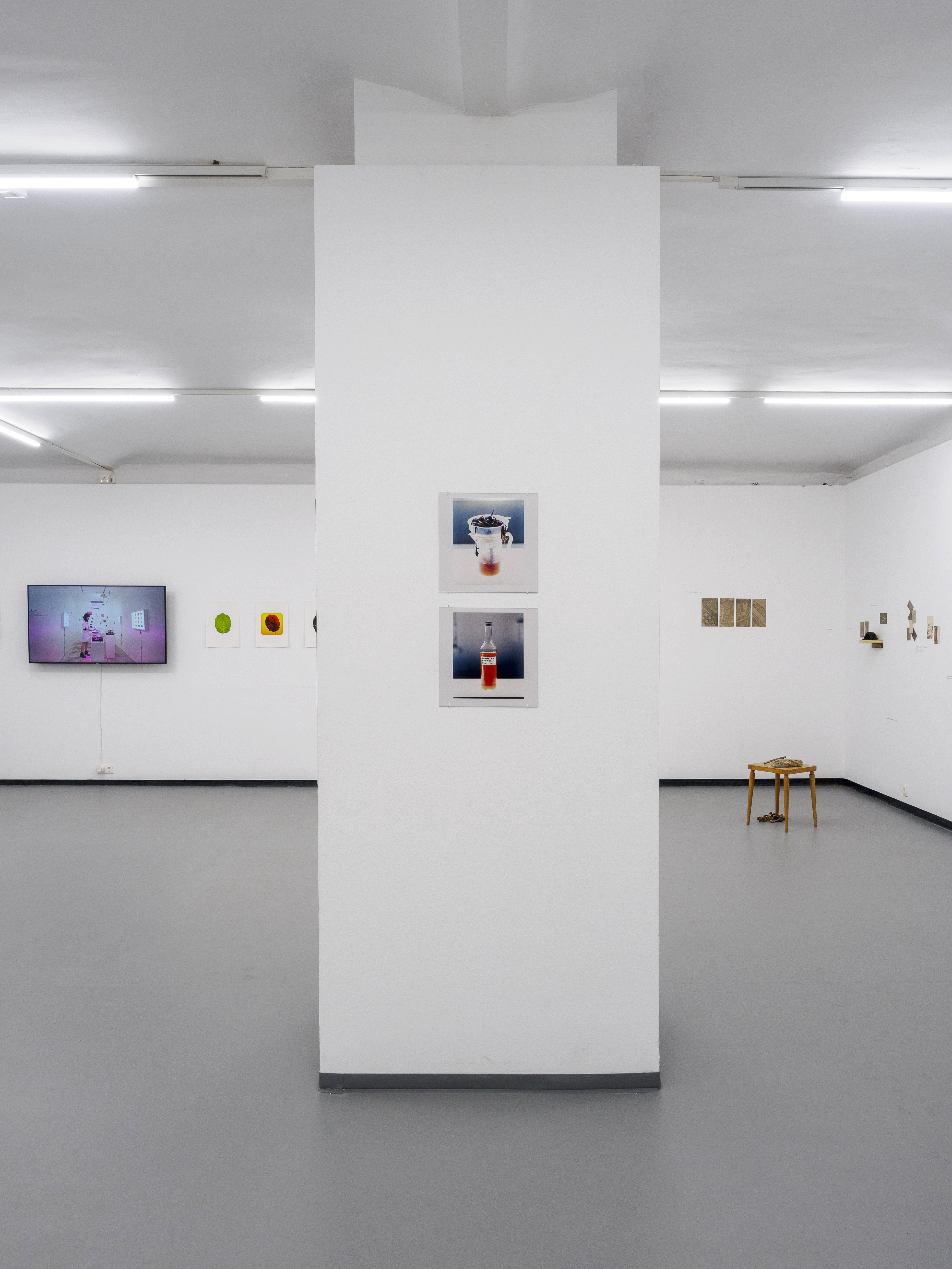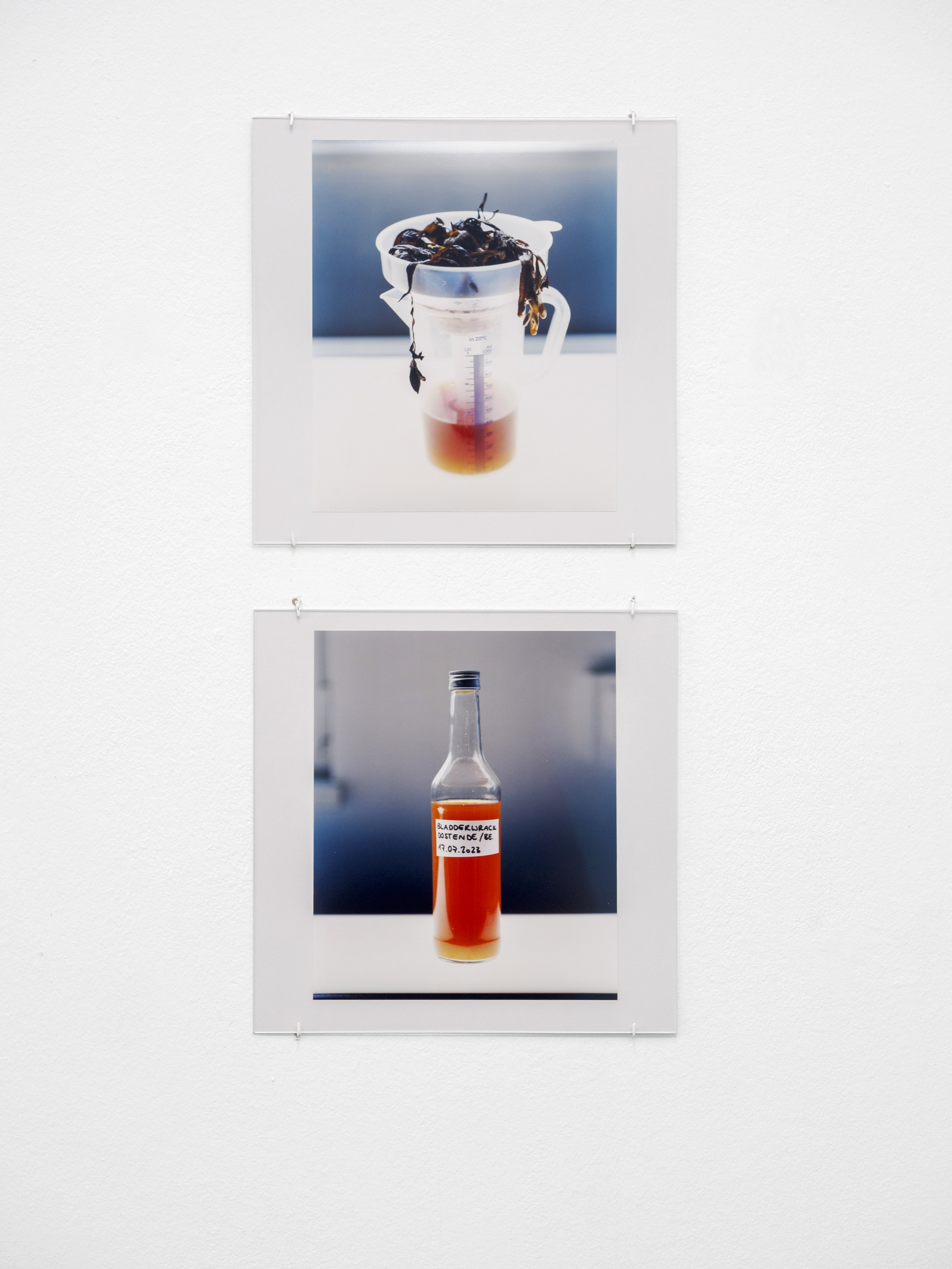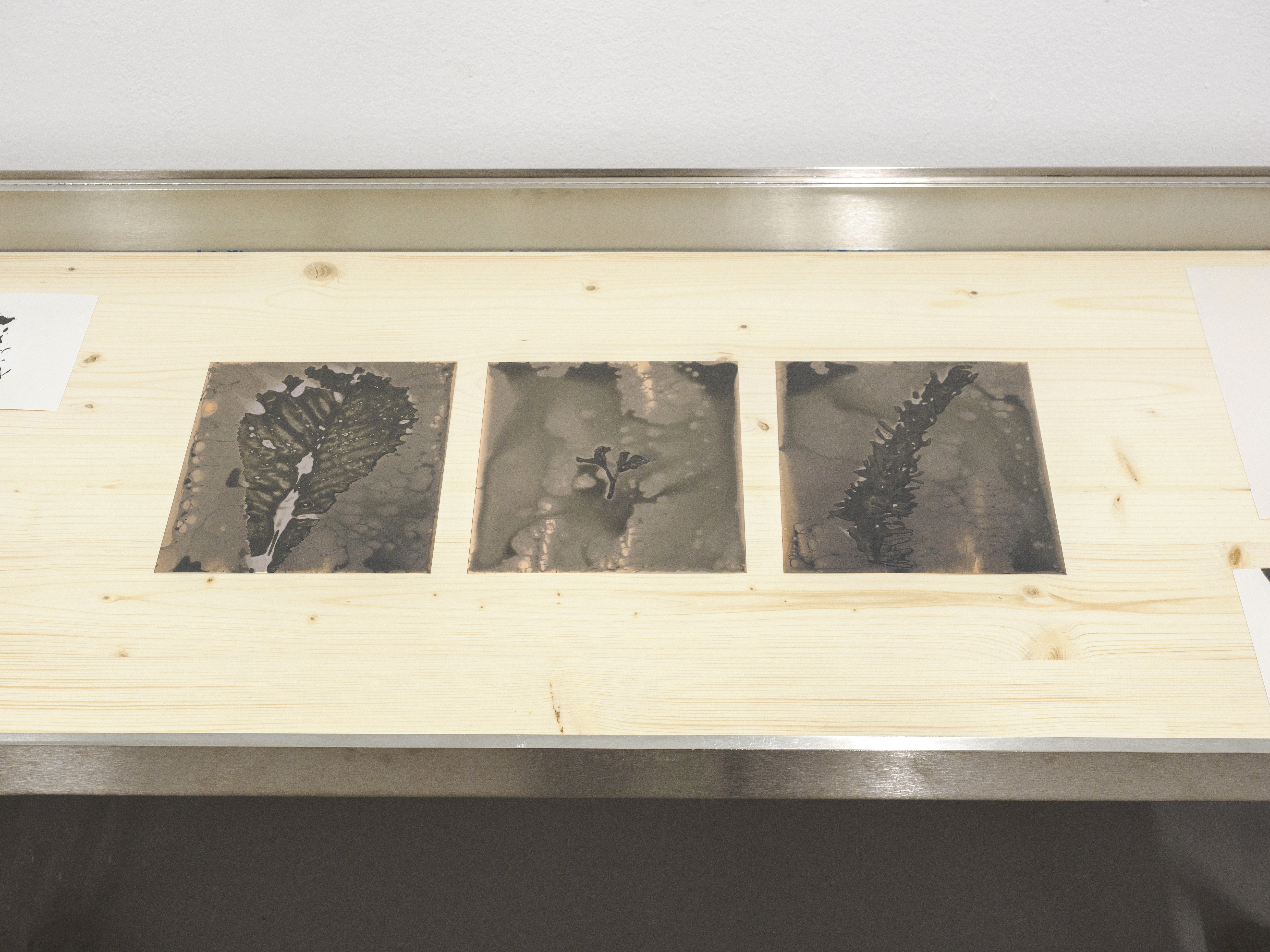 Bei den ausgewählten Werken von Cristin Al Shati handelt es sich um einen Teil der Serie liquid traces, die sie 2022 in Berlin begann. Hierbei nutzt sie die fotochemische Reaktion von Fixierer und Entwickler mit verschiedenen ausgewählten Materialien, die sie auf analoges Fotopapier aufträgt. Anders als bei konventionellen Fotografien entstehen Chemiegramme nicht durch die Belichtung, sondern durch die direkte Bearbeitung des Fotopapiers mit klassischen Chemikalien. Dabei setzt Al Shati bewusst auf nachhaltige Praktiken, indem sie Second-Hand-Papiere, wie zum Beispiel altes ORWO-Papier aus den 1980er- Jahren und bereits gebrauchte Fotochemie verwendet.