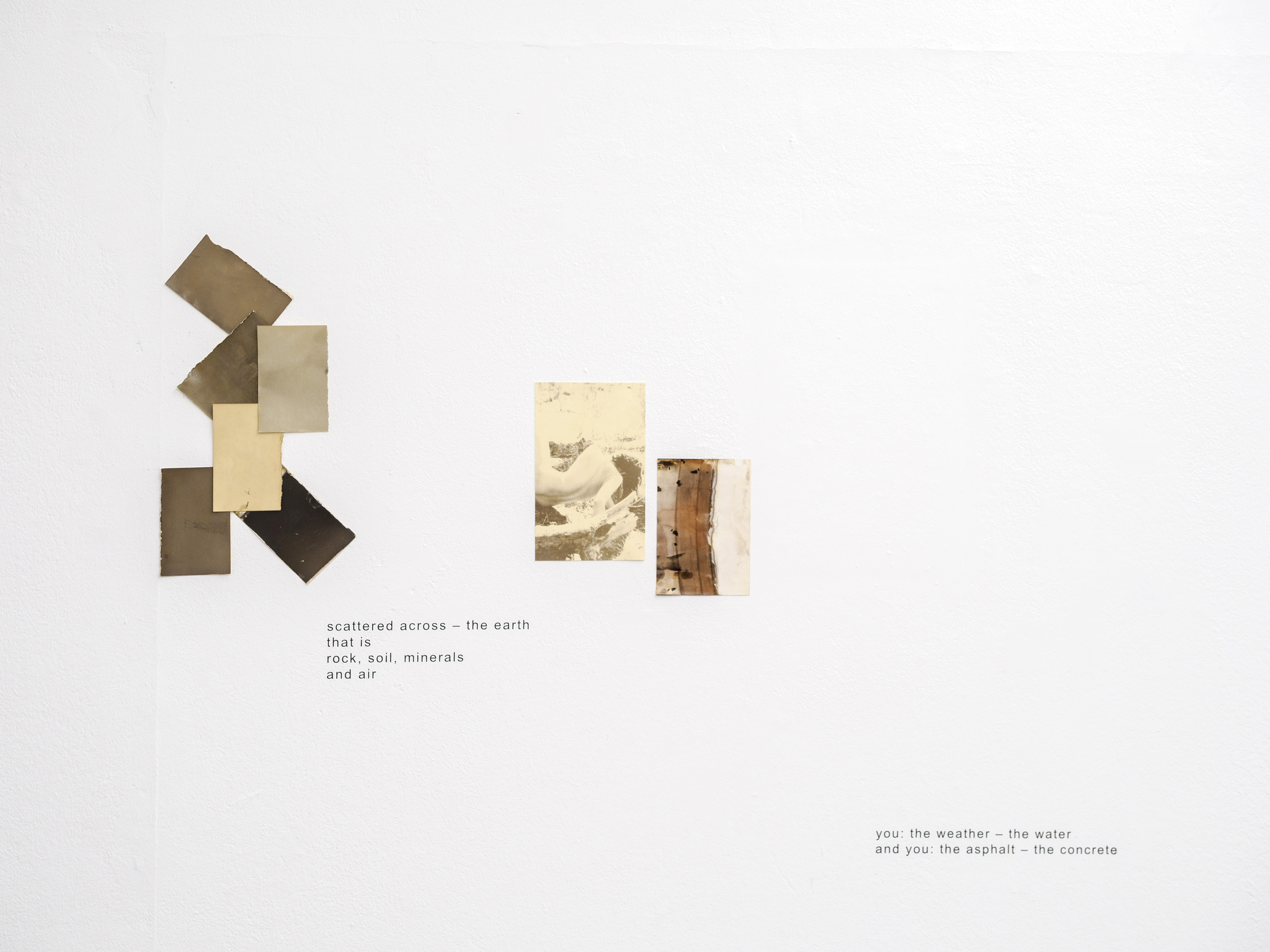 In der Serie somewhere else entirely bezieht sich Kristina Feldhammer nicht nur auf die Vielzahl der Orte, Materialien und anderer Körper, mit denen ein Mensch, ein vermeintliches Individuum, verbunden ist. Sie möchte auch ein anderes Verständnis des eigenen Körpers vorschlagen, der sich, als andauernder Prozess, über organische wie anorganische Materie ständig neu zusammensetzen lässt. Der Serie liegt eine mehrtägige Performance in der Lobau zugrunde, die das Bewegen und Schreiben an und mit dem Ort und seinen ökologischen und politischen Gegebenheiten sowie das Entnehmen von Wasserproben an verschiedenen Stellen des Auengebiets umfasst. Letztere wurden später auch zum Verarbeiten der Fotografien verwendet und bestehen weiterhin, in veränderter Form, als Rückstand in den Sammelgläsern.