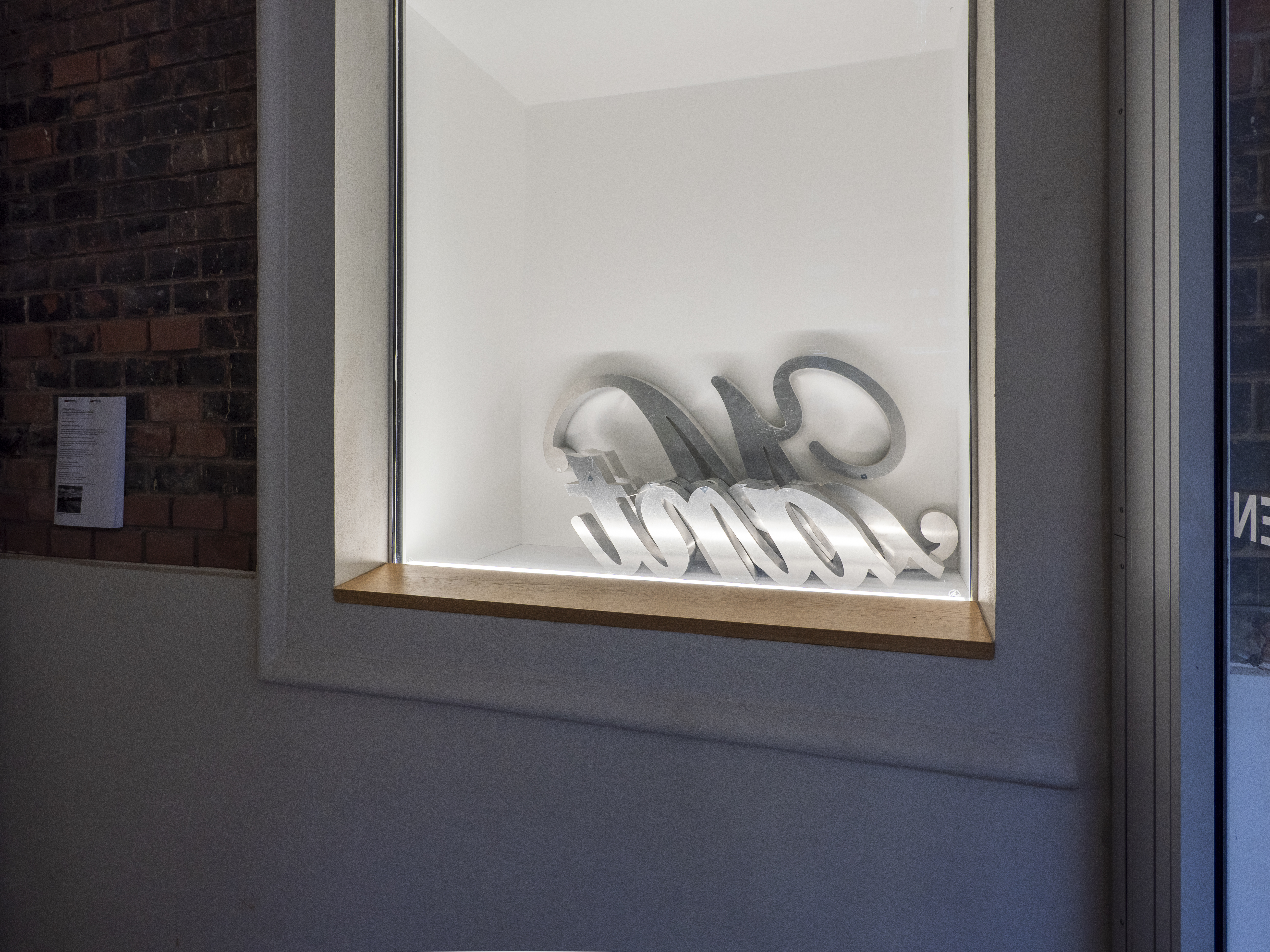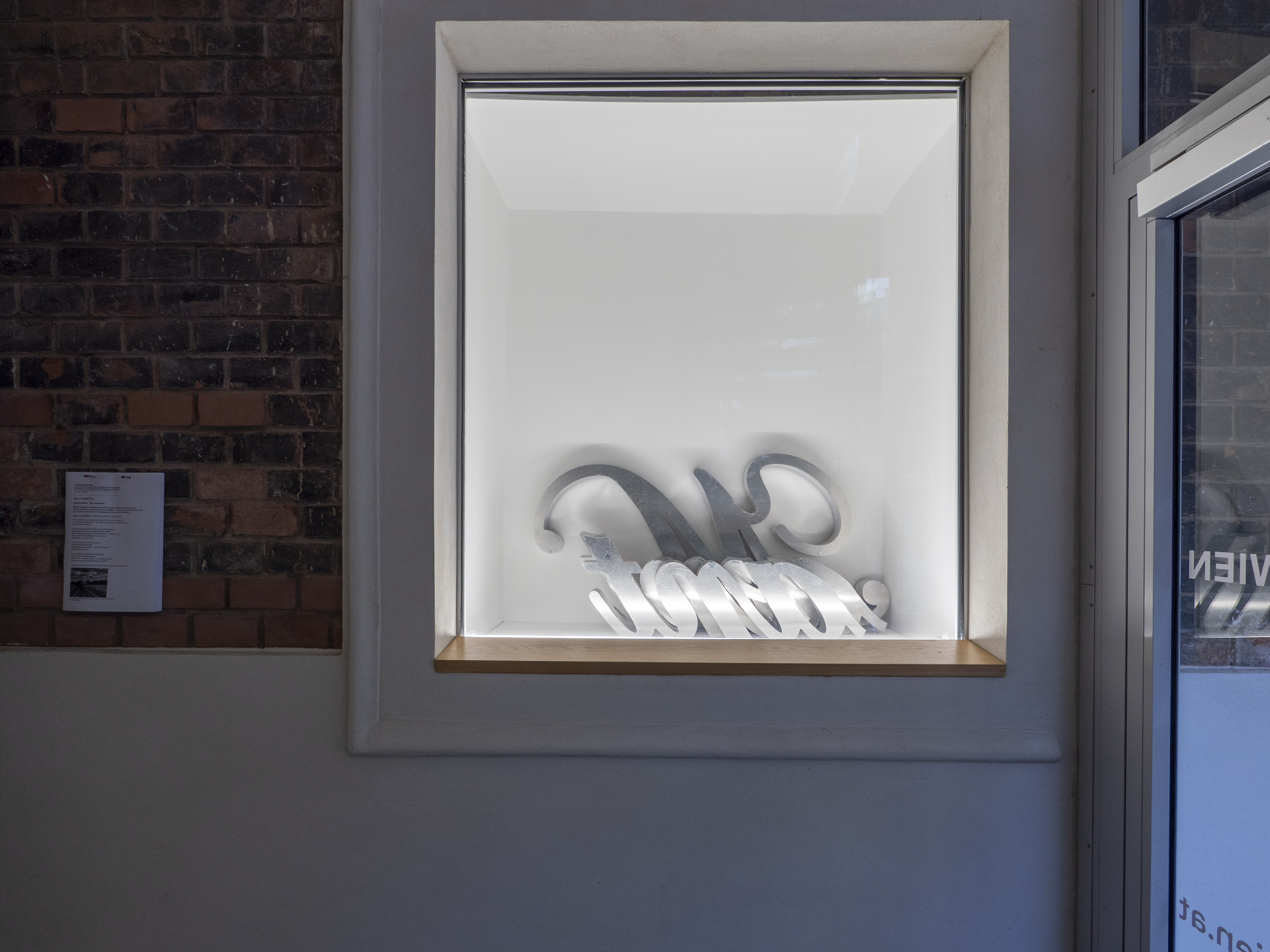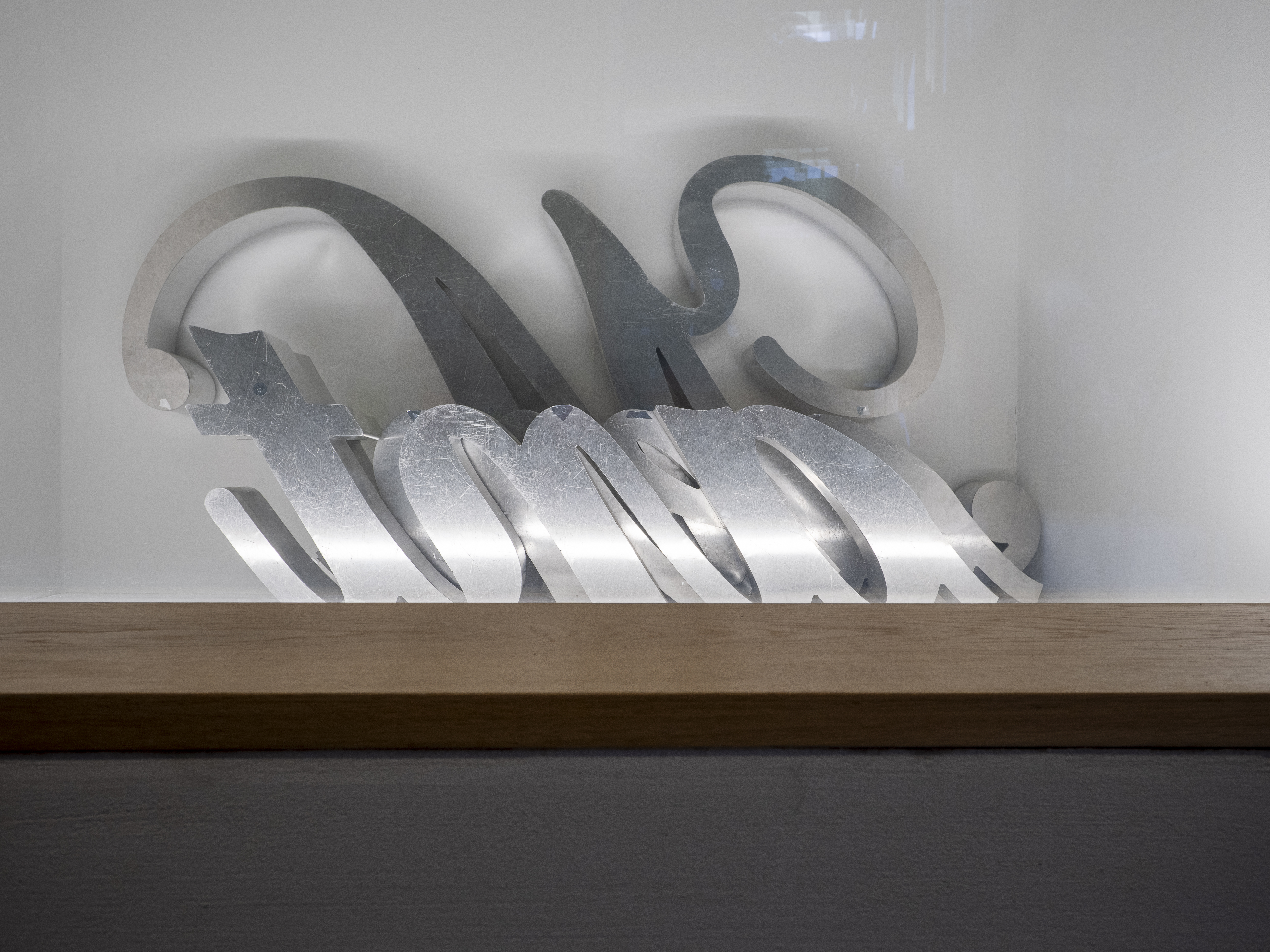 In dieser Ausstellung sind Teile eines Schildes mit dem Wort „Maintenant“ zu sehen. Das ist Französisch und bedeutet „Jetzt“. Das Schild war letztes Jahr Teil einer Kunstaktion. Für eine Ausstellung in Frankreich.