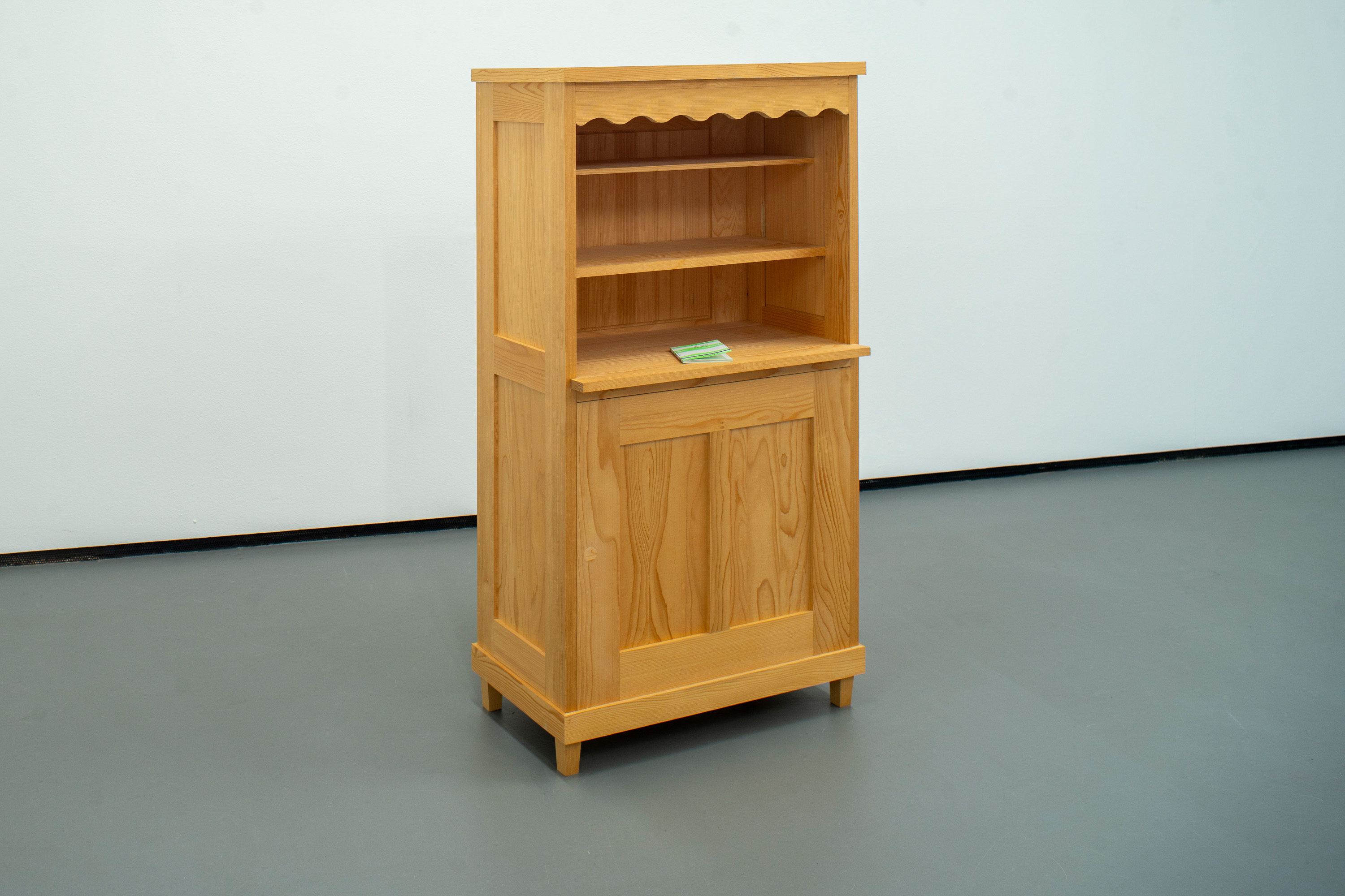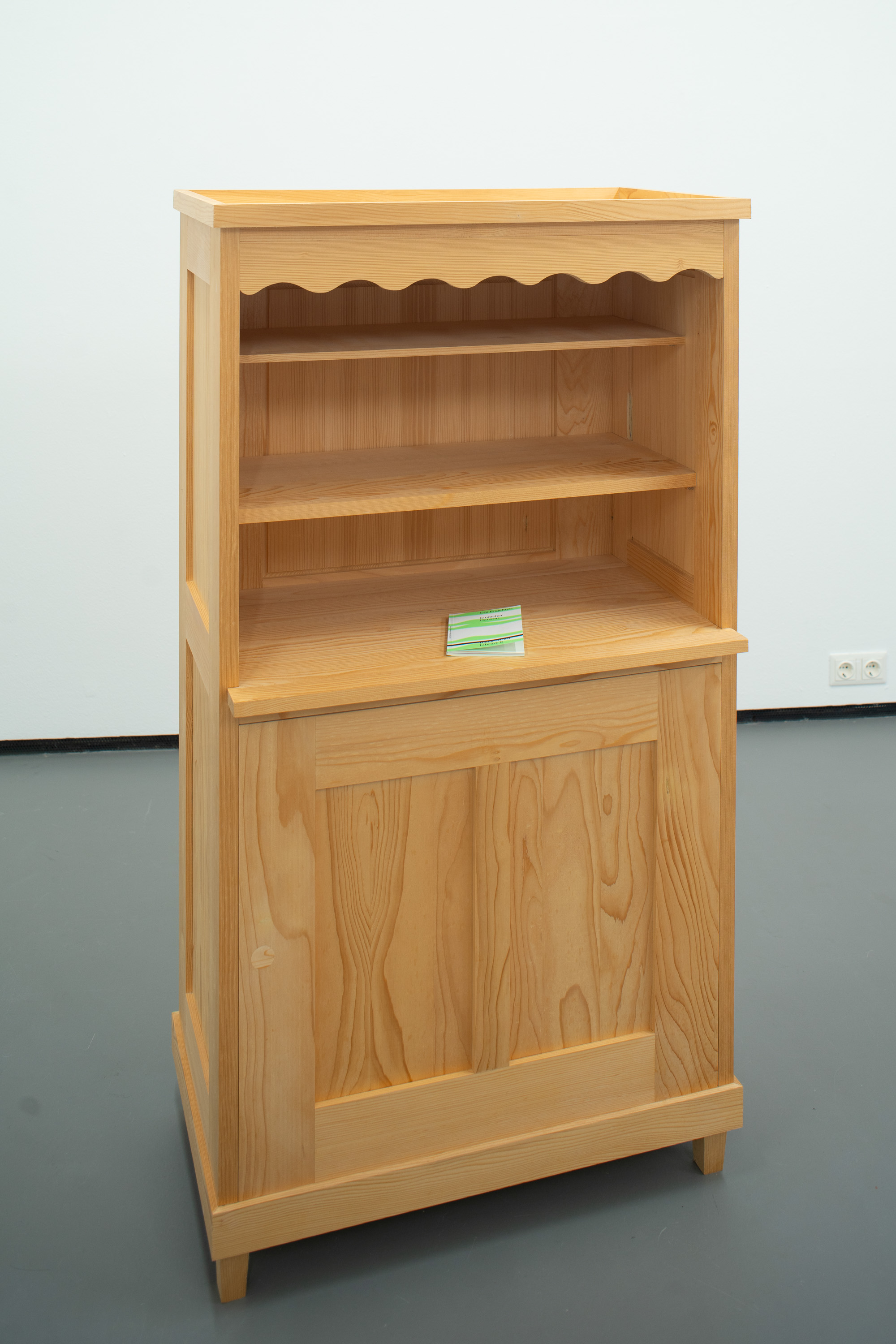 Eva Engelbert bezieht sich in ihrem Beitrag auf einen Wettbewerb, den die k.k. Kunstgewerbeschule Wien 1916 unter dem Motto Einfacher Hausrat ausrief, um preiswerte Möbel für die durch den Ersten Weltkrieg verarmte Bevölkerung zu schaffen. Der Nachbau eines damals eingereichten Entwurfs für einen Speiseschrank sowie Engelberts Künstlerinnenbuch Einfacher Hausrat bilden hier die Versatzstücke für weitreichende Reflexionen über Themen wie marginalisierte weibliche Kreativität, Möbeldesign zwischen Gestaltungsanspruch und sozialer Verantwortung, Materialgerechtigkeit und soziale Fürsorge.