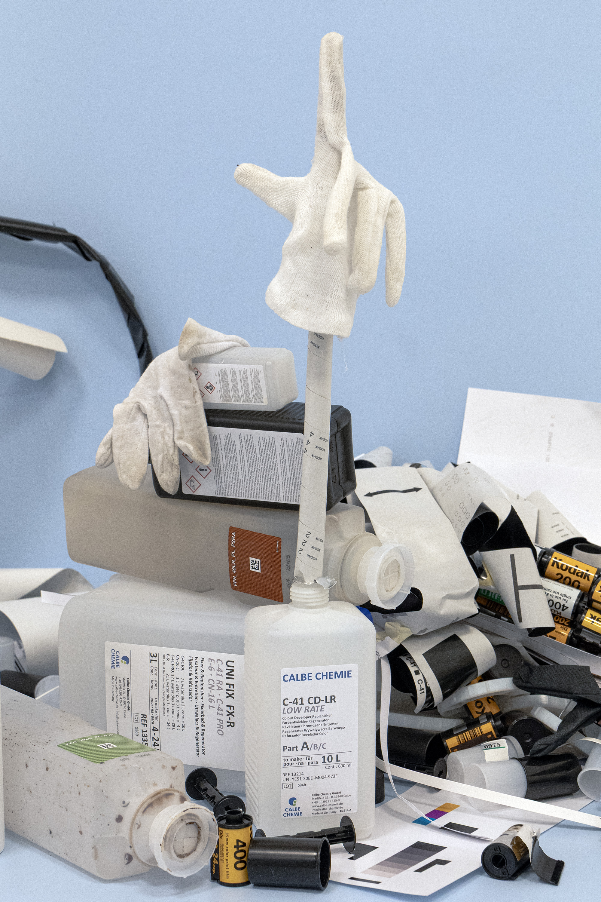 The material becomes a repository of stories. This exhibition examines the sensual and narrative qualities of photographic materials beyond their function of producing images. What stories lie dormant in the remnants? What traces does the production process leave behind? What aesthetic and ecological inscriptions become visible? Here, photography does more than produce images; it expels its own material afterlive. The body of work sinks into the pile of material and becomes part of the structure itself.